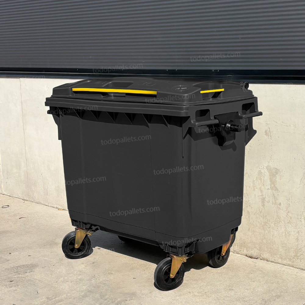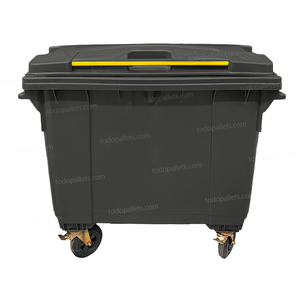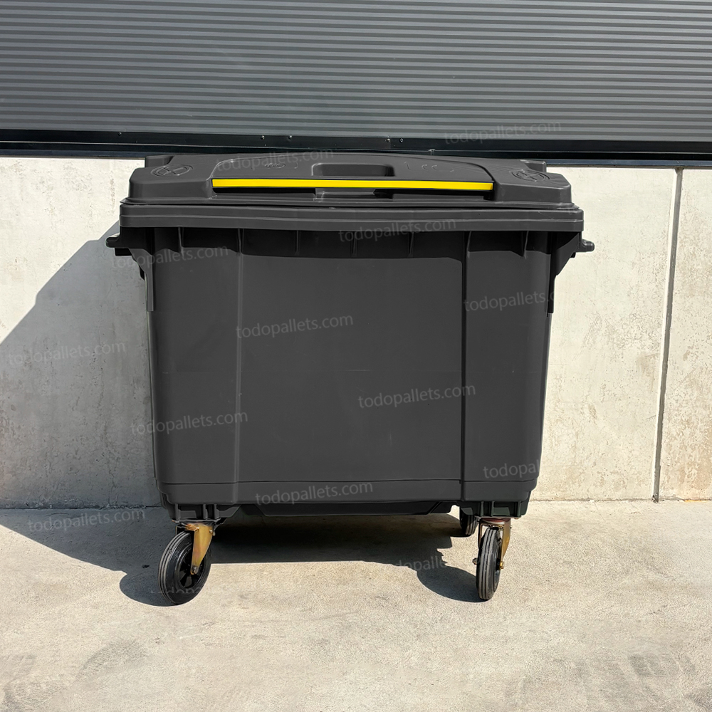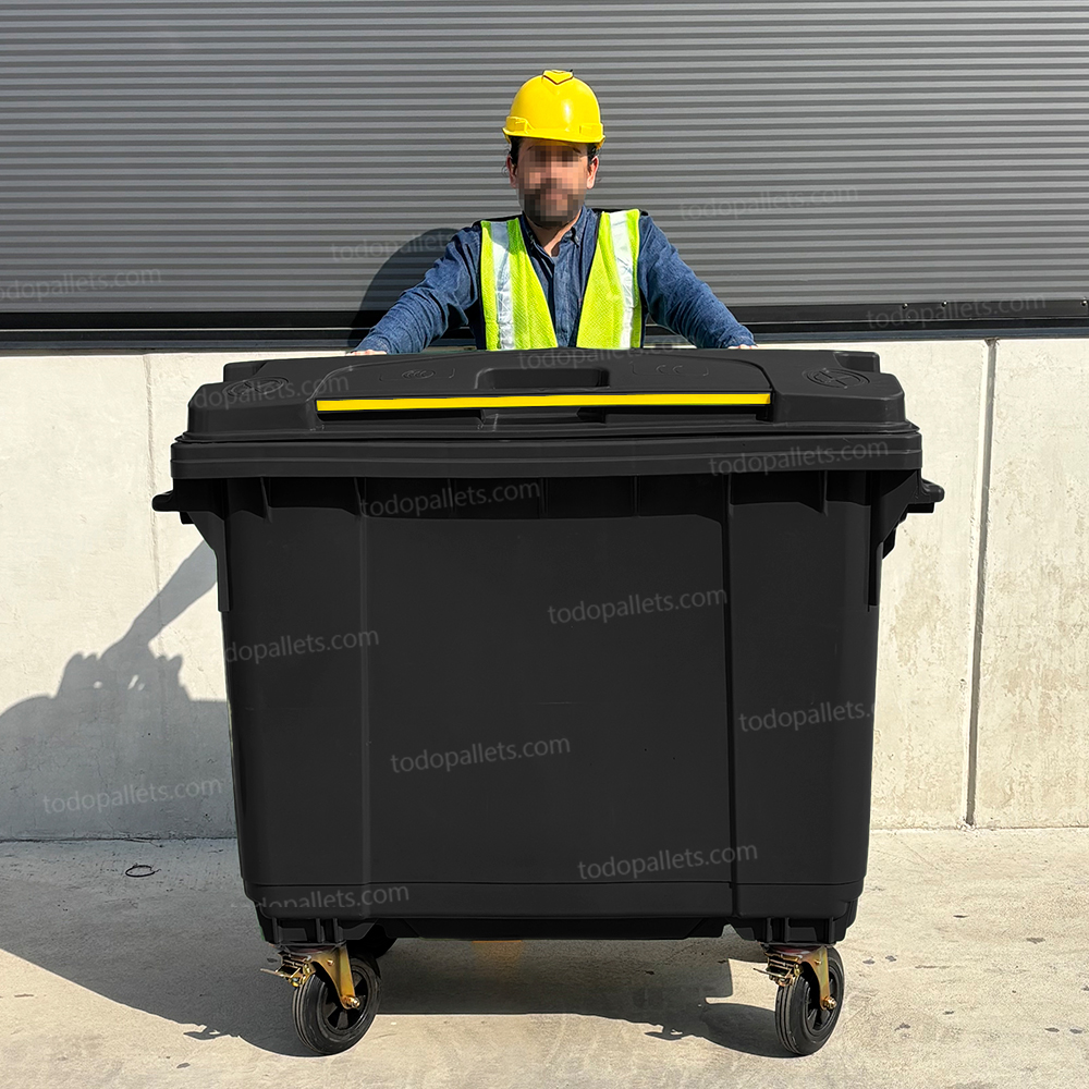 Contenedor de plástico de 1100 litros en color negro, fabricado en HDPE moldeado por inyección de alta presión. Cuenta con cuatro ruedas de caucho sólido, dos de las cuales están equipadas con frenos para un manejo seguro. Su estructura reforzada permite la recolección mecanizada, y su material resistente a cambios de temperatura y productos químicos asegura una durabilidad prolongada.