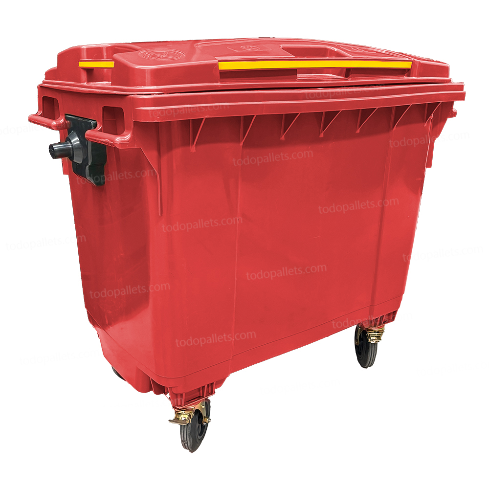 Contenedor de plástico de 1100 litros en color rojo, fabricado en HDPE moldeado por inyección de alta presión. Cuenta con cuatro ruedas de caucho sólido, dos de las cuales están equipadas con frenos para un manejo seguro. Su estructura reforzada permite la recolección mecanizada, y su material resistente a cambios de temperatura y productos químicos asegura una durabilidad prolongada.
