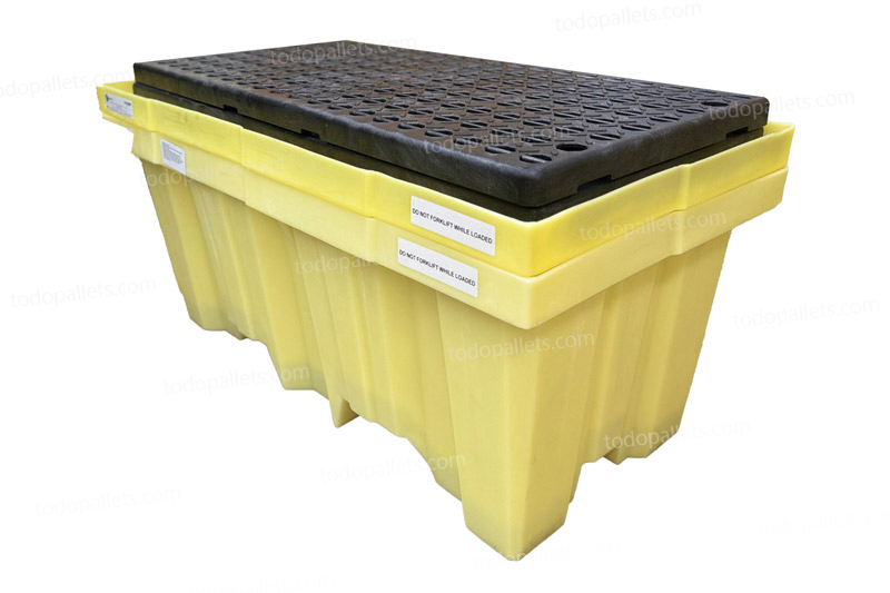 Tarima de plástico antiderrames para 2 Tambos Industriales, resistente a químicos altamente corrosivos o peligrosos. Fabricada con PE (Polietileno) 100% Virgen de Alta Densidad (HDPE). Aprobada por Normas: EPA 40 CFR 264.175, SPCC, UFC y NPDES. Reduce costos y optimiza el espacio de almacenamiento gracias a su diseño anidable. Cumple y excede la norma, cuenta con capacidad de derrame de hasta 250 litros.